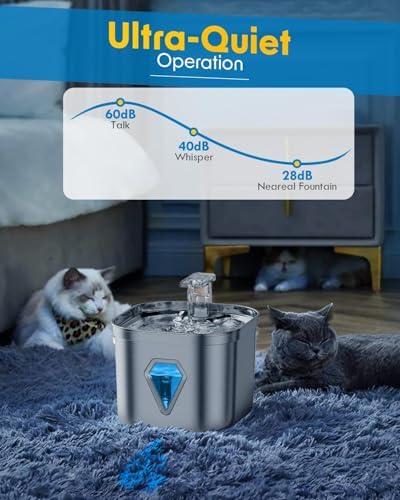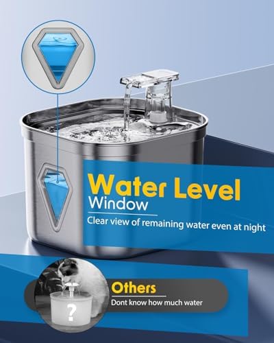 Pioneering Design: Besides great features, our stainless steel cat fountain water bowl shows a unique shape and practical design. With the transparent water graduated scale outside the full-metal shell of the cat water dispenser, we can know how much water remaining and consider when to add water.