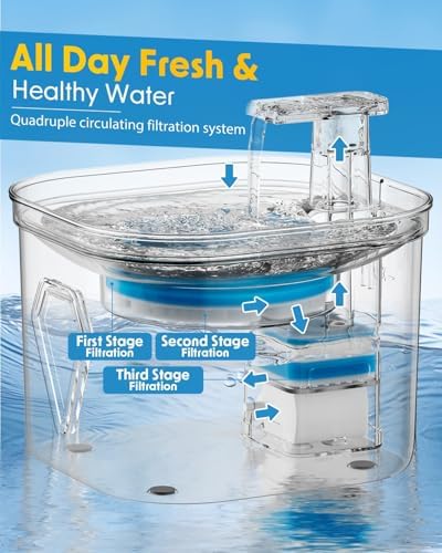 Tenfold Filtration System: We spare no effort focusing on the health of your pets. Equipped with 10 layers of filters, our water fountain for cats inside can remove impurities from water effectively, providing ultra-clean drinking water for your pets.