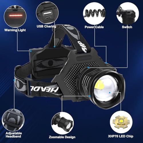 【IPX6 Waterproof & Comfortable】: Headlamp rechargeable waterproof which means it can withstand heavy rain and splashing water. Will suitable for rainning days and snowing days, headlight very comfortable to wear, making it ideal for extended use. The adjustable headband ensures that led head torch rechargeable fits comfortably on any head size