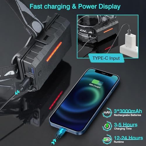 【Rechargeable Headlamp & 4 Power Indicator】: Head Lamp designed to provide with a reliable and convenient lighting solution that will last for a long time. This headlamp is rechargeable, so you don’t have to worry about constantly replacing batteries, The headlamp with 4 power indicators to let you know when it’s time to recharge