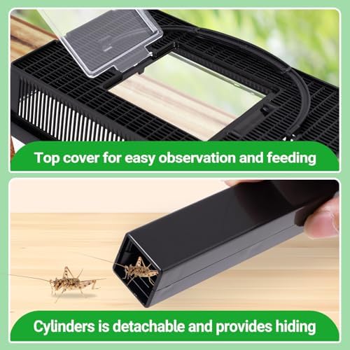 【Reptile Cricket Keeper】: Made of acrylic material, transparent and clear, easy to observe; Equipped with a black hiding tube and a handheld design, it is easy to carry when going out; Detachable and well ventilated lid;