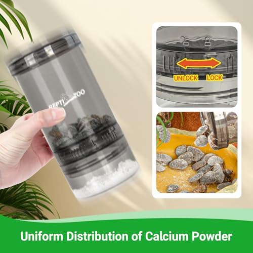 【Calcium Powder Mixer】: The top is equipped with a rotating opening, which can flexibly adjust the outlet size and effectively control the amount; Bottom storage to avoid waste; The high bottle body design prevents cricket from crawling out;