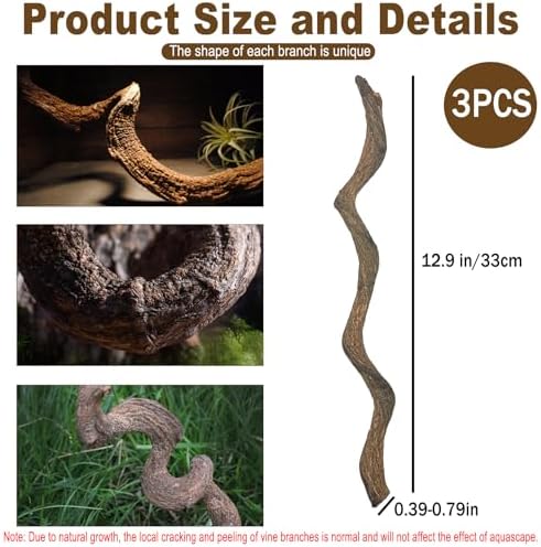 【Size and Note】The reptile branch decoration is approximately 12.99 inches long, with a diameter of about 0.39-0.79 inches for the fine vines. Suitable for lizards, bearded dragons, geckos, chameleons, snakes, frogs, and other reptiles. Note: Each natural branch is unique, with varying widths and lengths.