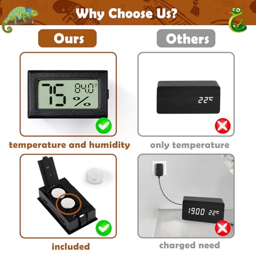 Easy to Install: With the help of the included double-sided adhesive, you can fix the humidity thermometer in any ideal position in seconds without complicated tools or tedious steps. The cordless design avoids cumbersome wiring and keeps your animal tank environment neat and undisturbed.