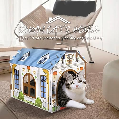 [FUN GETAWAY VILLA STYLE]: Crafted from pressed cardboard, this indoor cat house is both dense and sturdy, offering your kitty a cozy and stylish retreat. The adorable getaway villa design adds charm to any space, and its portable features make it easy to move around.