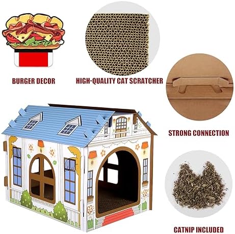 [CORRUGATED SCRATCHER & CATNIP INCLUDED]: This cardboard cat scratcher house’ corrugated texture helps groom their nails as they dig in and keeps your scratching board for the cat fresh at all times. Your furry friend meets this fun surface to scratch, which helps groom their claws. Sprinkle with catnip to attract and encourage your cat to use this scratcher. The catnip for cats helps you entice your kitty to have good scratching habits and keeps your cat interested and entertained for hours.