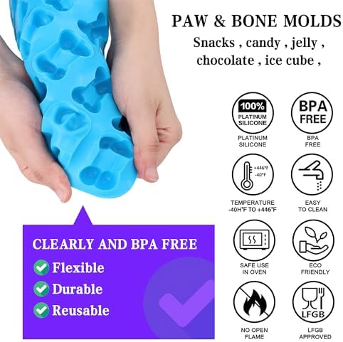 【Dog Silicone Mold】: Our paw molds silicone is great for making chocolate, candy, gelatin, fruit snacks, ice cubes, dog treats, baked dog snacks cookies, cookies, scones, dough, empanadas, pancakes, tarts, canned goods, donuts, vegetables, muffins, bread, ravioli noodles, soap, cakes, breads, jellies, dog bone pans, puddings and more. Use it to bake, cook, fry eggs or make pancakes. Your kids or pets will love this when the pop-up shapes are detailed.