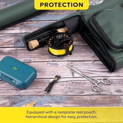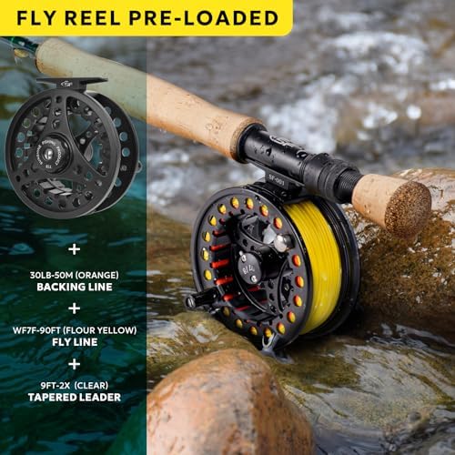 Pre-loaded fly reel: Matt black 3/4wt, the die-cast aluminum-alloy reel adopts surface anti-corrosion treatment. And the large arbor design is helpful to quick line retrieval. It is pre-loaded with WF3F-90FT fly line(Fluorescent Yellow), 20LB-50M backing line(Orange), and 9FT-6X tapered leader nylon(Clear). It is very suitable for fishing lovers and beginners.