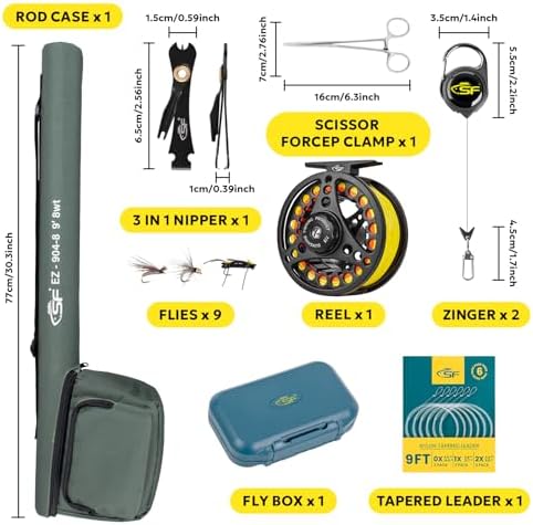 Fly Rod Features: SF 3 Weight 7.6 Foot medium-fast action fly rod body is made of pure IM7 24T plus 30T emerald green carbon fiber for good durability. The aluminum alloy reel seat with two lock rings for secure reel mounting. And stripping guides inserts and chrome guides for smooth gliding fly lines. For a comfortable grip, the rod is fitted with a 6.9-inch-long Western-style cork handle. And the hook keeper on the rod blank for holding flies.
