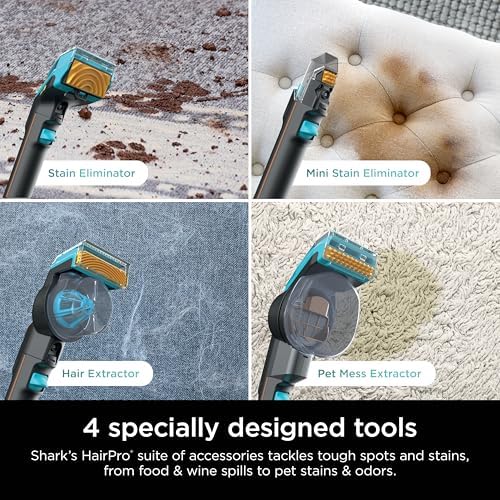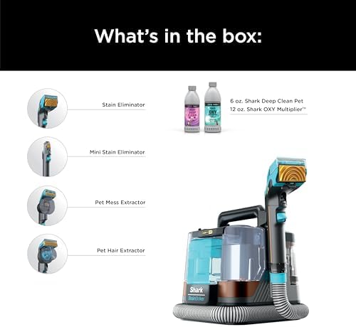 WHAT’S INCLUDED: Shark StainStriker HairPro, Mini Stain Eliminator, 3.5″ Stain Eliminator, Hair Extractor, Pet Mess Extractor, 6oz Deep Clean Pet Formula, 12oz OXY Multiplier Formula