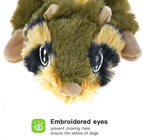 Material: Floppy plush Size: Chipmunk Dog Toy: 16.92height x 3.94 width Pig Dog Toy: 15height x 3.94 width Cow Dog Toy: 17.72height x 3.54 width Lion Dog Toy: 15height x 3.54 width Lamb Dog Toy: 14.1height x 3.94 width Leopard Dog Toy: 17.72height x 3.54 width Fun and cute shape 6 pack dog toys make them easy for dogs of all breeds and size to carry, play with and snuggle, they are perfect gifts for your lovely dogs to kill bored time. Great value for the amount of toys you get. Dogs are obsessed with these plush dog toys. Ideal dog toys for small dogs, but large and medium pups love our unstuffed dog toys just as much; Their floppy light weight bodies make these plush dog toys easy for small dogs to carry, toss, and roll around with. Crinkle paper and squeakers all over the body make dogs wont just focus on one to rip apart. They’re actually lasting longer than her other soft toys. These toys are made of 100% non-toxic material, very safe for your furry friends. Hand-embroidered eyes and no stuffing design can prevent the dogs from swallowing. Its suitable for dog chewing and cleaning. Not for aggressive chewers. Because our dogs are enjoy ripping everything apart, all proud like they killed it, we recommend supervised play, and timely * of the broken ones. Due to manual measurements, please allow slight different in sizes.