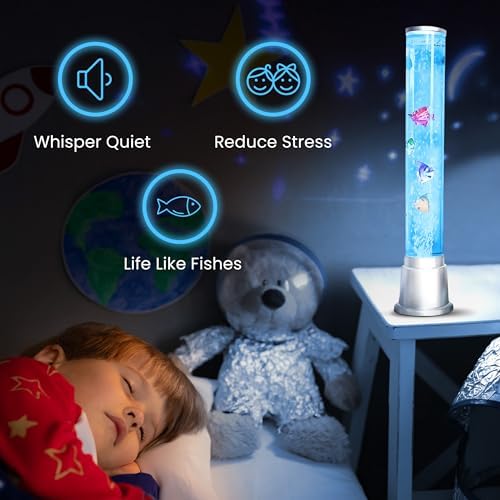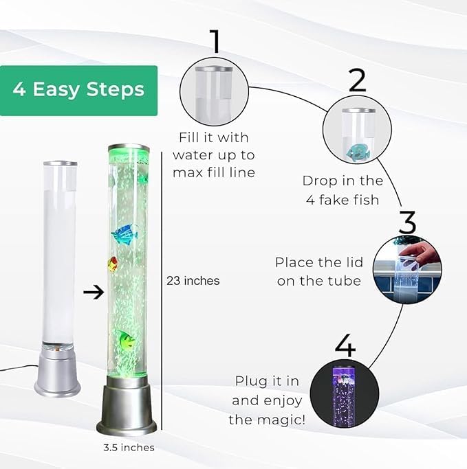 MATERIAL – Crafted from ABS thermoplastic polymer, our sensory fish tank tube is both durable & long-lasting. This bubble fish lamp includes a sensory bubble tube lamp with four fake fish and a power cord for easy setup. With its sturdy construction and mesmerizing visual effects, this water bubble lamp is perfect for home or office decor.