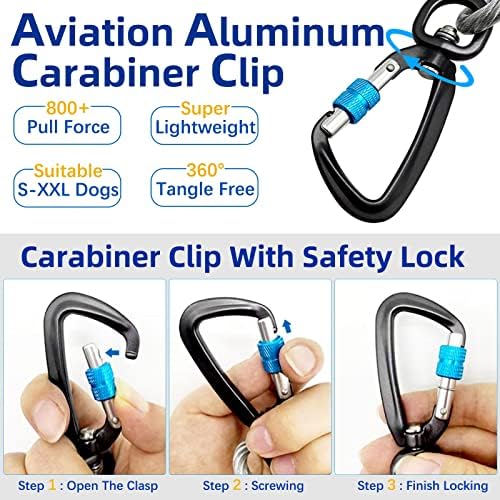 AVIATION ALUMINUM CARABINER CLIPS:The 360°tangle free clips is made of top quality rust-free aviation aluminum, which is very lightweight, give dogs more ease, but also durable enough to withstand the most intense pulling . The rotation tightening technology prevent loosing off when dog running and playing.