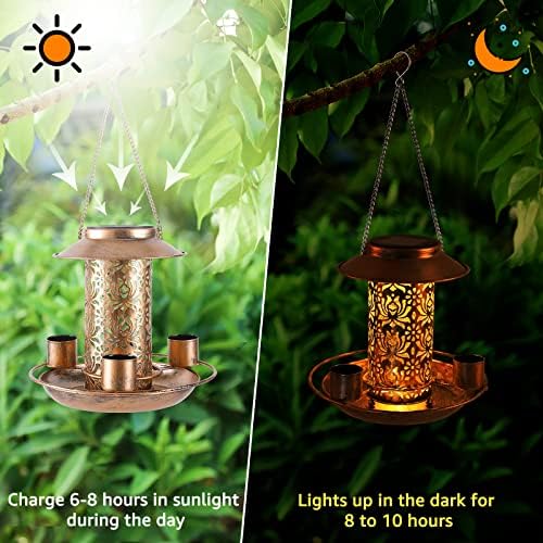 This solar bird feeder is made of heavy duty metal, durable and anti-rust. With a upgraded waterproof solar panels, it will illuminate your garden for 8-12 hours at the night.