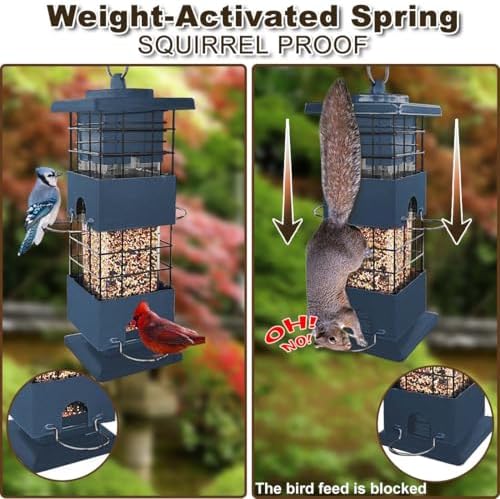 It is calibrated to support the weight of birds but not squirrels. When squirrels attempt to approach the bird feeder’s seed port, the weight activated spring will be pulled down, blocking the birdfeeder’s feeding port.