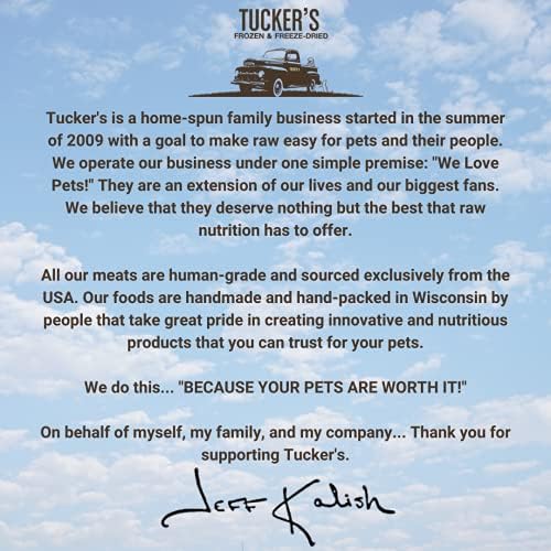 Tucker’s is a home-spun family business started in the summer of 2009 with a goal to make raw easy for pets and their people. We believe that our pets deserve nothing but the best that raw nutrition has to offer. All our meats are human grade, human edible, federally inspected, and sourced exclusively in the USA. We make our limited ingredient diets in our own Wisconsin facility… “Because Dogs Are Worth It!”