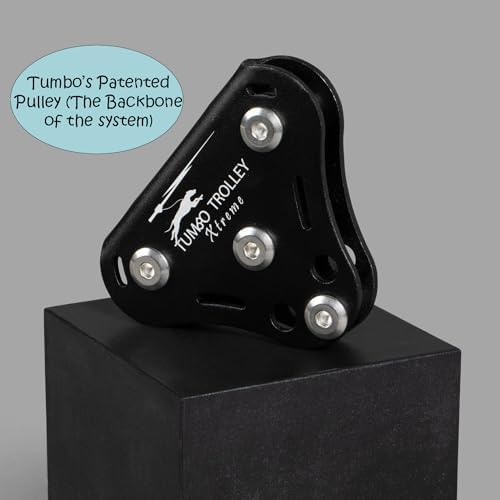 Exclusive Tumbo Tri-Pulley – Our unique to Tumbo smooth rolling triple wheel pulley replaces the standard one or two wheeled pulleys found on the most basic 100 ft dog leash. These small dog trolley tie outs typically rust or start binding up at some point during their life. Our patent pending pulley has two wheels above the cable for a smooth ride, and one wheel below to keep the zipline cable in line when your large dog is going crazy! This is for more active dogs vs the dog trotter.