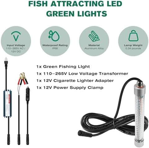 12V LED Fishing Light: The package comes with a power clip and cigarette lighter with an input voltage of 12v DC. Easy to install and carry, this fish trap light is the perfect companion for outdoor fishing