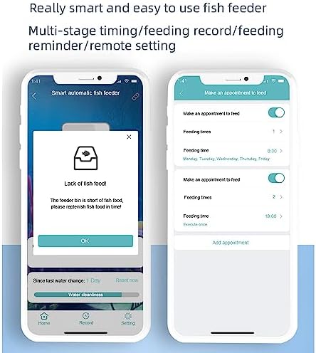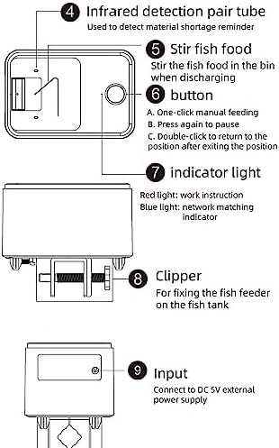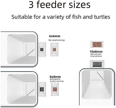 100ml large capacity, the enlarged fish food bin can meet the intelligent feeding needs of large fish.Sealed fish food bin, sealed and moisture-proof, transparent design for easy observation.Electric feeding bin, built-in anti-clumping device, spring device pulls the flap thimble, along with opening and closing the feeding bin push and pull back and forth to loosen the fish food without clumping.Perfect feeding, no clogging of feeding hole, precise feeding of fish food, no clumping of fish food particles.Cellphone remote monitoring, multi-segment timing, remote viewing of feeding records, lack of food to remind.Built-in infrared detection tube to detect lack of food, APP reminder.Easy to install, thread fixing clip design, used to fix the fish feeder firmly on the fish aquarium.It comes with 3 sizes of feeding ports, 6*6mm small port, 8*8mm medium port and 18*10mm large port, to meet your various needs.Suitable for a variety of feed, can automatically put all kinds of fish food, particle feed, flake feed, pellet feed, strip feed and other specifications, to meet your different needs.