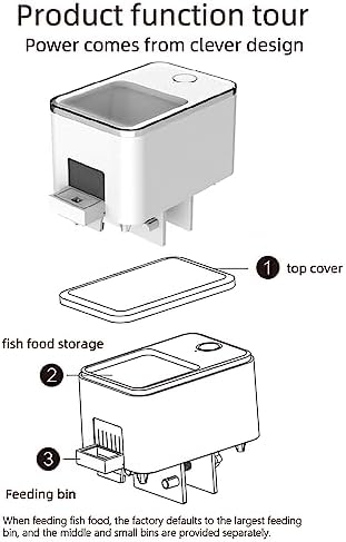 Scientific fish feeding, precise rationing, food control, dual anti-blocking, one button feeding. 100ml large capacity, sealed fish food bin, sealed and moisture-proof, transparent design for easy observation. Electric feeding bin, built-in anti-clumping device, spring device pulls the flap thimble, along with opening and closing the feeding bin push and pull back and forth to loosen the fish food without clumping. Cellphone remote monitoring, multi-segment timing, remote viewing of feeding records, lack of food to remind.