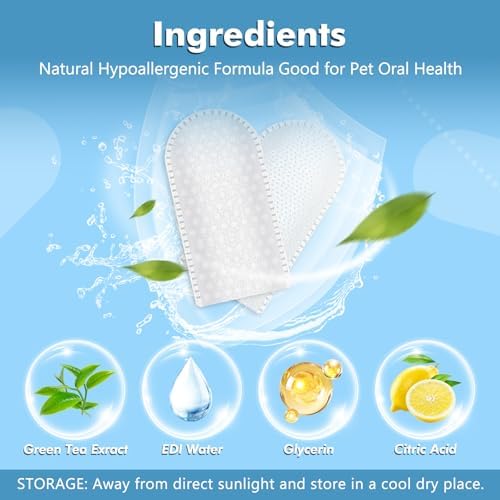 【Safe and Gentle Ingredients】Our pet dental care finger wipes are formulated with a blend of EDI Water, Glycerin, Green Tea Exract, Citric Acid, Chlorophyllin Essence. Safe, gentle and effective for dog’s teeth cleaning!