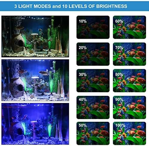 【3 MODES FISH LIGHT Switchable】The aquarium light has three kinds of switchable mixed lights: White-Green, Red-Blue, White-Green-Red-Blue.Submersible LED Aquarium Light with switchable 3 modes meet the lighting needs of different aquarium aquatic plants, freshwater fish and marine fish.Press power button, the first:White-Green, the second:Red-Blue, the third:White-Green-Red-Blue, and the fourth full off.