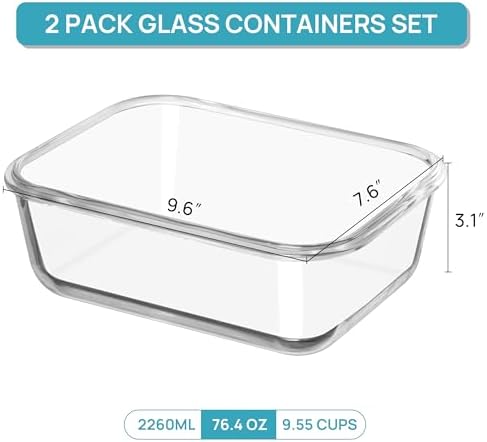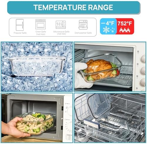 【Safe For Oven/ Microwave/ Freezer/ Dishwasher】The glass food containers are safe for oven, microwave, dishwasher and freezer. They can withstand temperatures from -4ºF to 752ºF (-20ºC to 400°C) which is good for food storage in fridge and keep food fresh. And you would eaily use the containers for roasting in oven. NOTE: Before putting it into the microwave/ oven, please take off the lids.