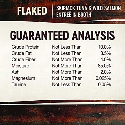 FLAKED TUNA AND SALMON: All-natural wet food delivers what your cat craves. Protein-rich recipe features delicate flakes of tuna and salmon in a delicious broth that supports daily hydration. We recommend serving at room temperature for maximum palatability.