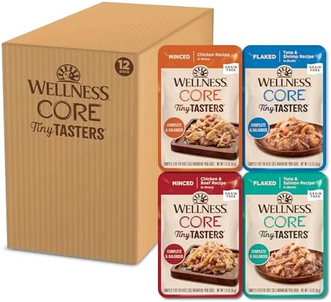 Wellness CORE Tiny Tasters is scientifically crafted with high-quality ingredients based on the nutritional philosophy that cats, given their primal ancestry, thrive on a diet mainly comprised of meat. With the textures cats’ love and the protein-packed flavor they crave, this Tiny Tasters Variety Pack of delicious recipes is sure to be a hit with even the finickiest of felines! Each is crafted with real, high-quality protein your cat needs to fuel their day along with moisture from wet food to support healthy daily hydration. Each recipe is in an easy-to-squeeze, single-serve pouch to make mealtime quick and easy —no can openers or spoons needed! This variety pack comes with 12 grain-free, complete & balanced meals in 4 different flavors — 3 Flaked Tuna & Shrimp, 3 Flaked Tuna & Salmon, 3 Minced Chicken & Beef, and 3 Minced Chicken