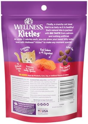Wellness Kittles Grain Free Natural Cat Treats, Salmon & Cranberries Recipe are irresistibly tasty, 100% all-natural wheat free, grain free crunchy treats made in USA only. These natural crunchy dental cat treats not only are as tasty as they are healthy, but have a crunchy texture that helps to clean your cat’s teeth – made for all life stages. Each all-natural treat bite is packed with big taste from whole-food ingredients like salmon, cranberries and blueberries. With nothing artificial and under 2 calories per treat, you can show your cat extra love with Wellness Kittles natural cat treats.
