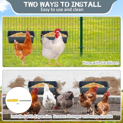 Sturdy Installation: equipped with heavy duty metal clips and expansion screws, the chicken feeder ensures a solid installation, hanging stably on metal grids, fences, or walls, keeping the feed elevated from the ground; This positioning promotes feed hygiene and cleanliness while diminishing waste, a vital feature for optimal poultry management